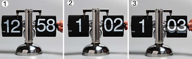Металевий каркас рами годинника з перекидними пластинами з міцного, якісного пластику, надійний шестеринковий механізм, все це забезпечить довгу та якісну роботу годинника. Годинник Flip Clock має дванадцятигодинний формат часу. Годинник зображається на перекидній пластинці зліва, а хвилини на перекидній пластинці праворуч, весь годинник на виробництві збираються в ручную.